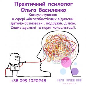 ?Проводиться запис до практичного психолога Ольги Василенко.? Територіально: Бориспіль, с.Гора. ?Консультування в сфері міжособистісних відносин: дитячо-батьківські, подружні, ділові. ?Індивідуальні та...